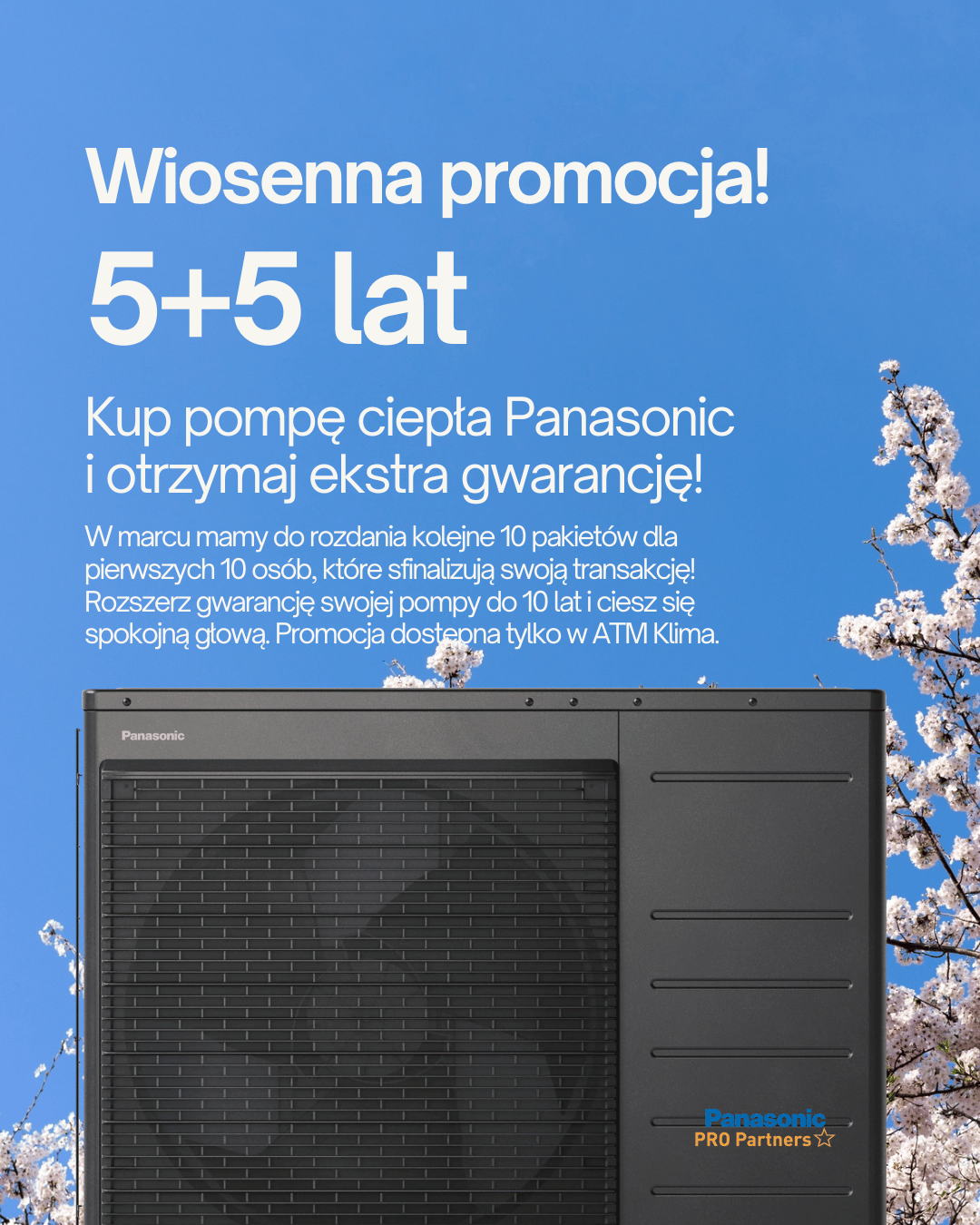 Kup pompę ciepła Panasonic w okresie od 1 marca 2026 do 31 marca 2026 w ATM Klima i odbierz 10 lat gwarancji na swoje urządzenie! (5 lat gwarancji Panasonic + dodatkowe 5 lat gwarancji ATM Klima).